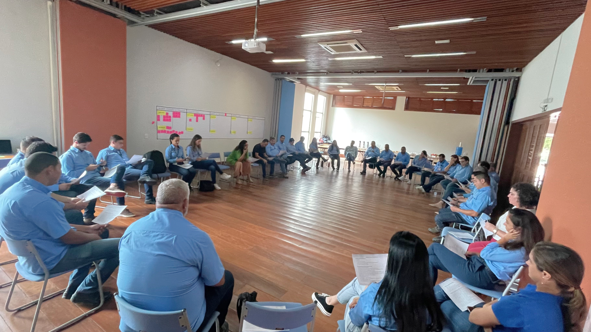 Durante o workshop, Mila conduziu uma atividade sociodramática, explorando questões relacionais presentes no ambiente de trabalho e promovendo reflexões profundas entre os participantes.